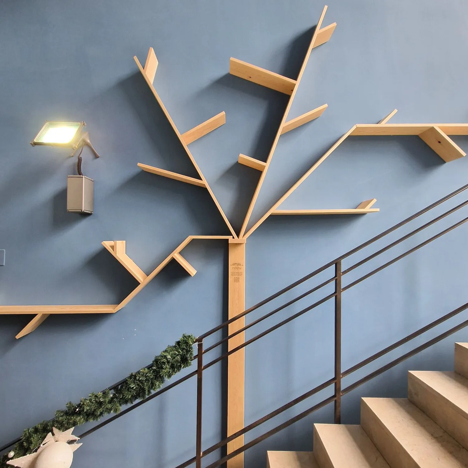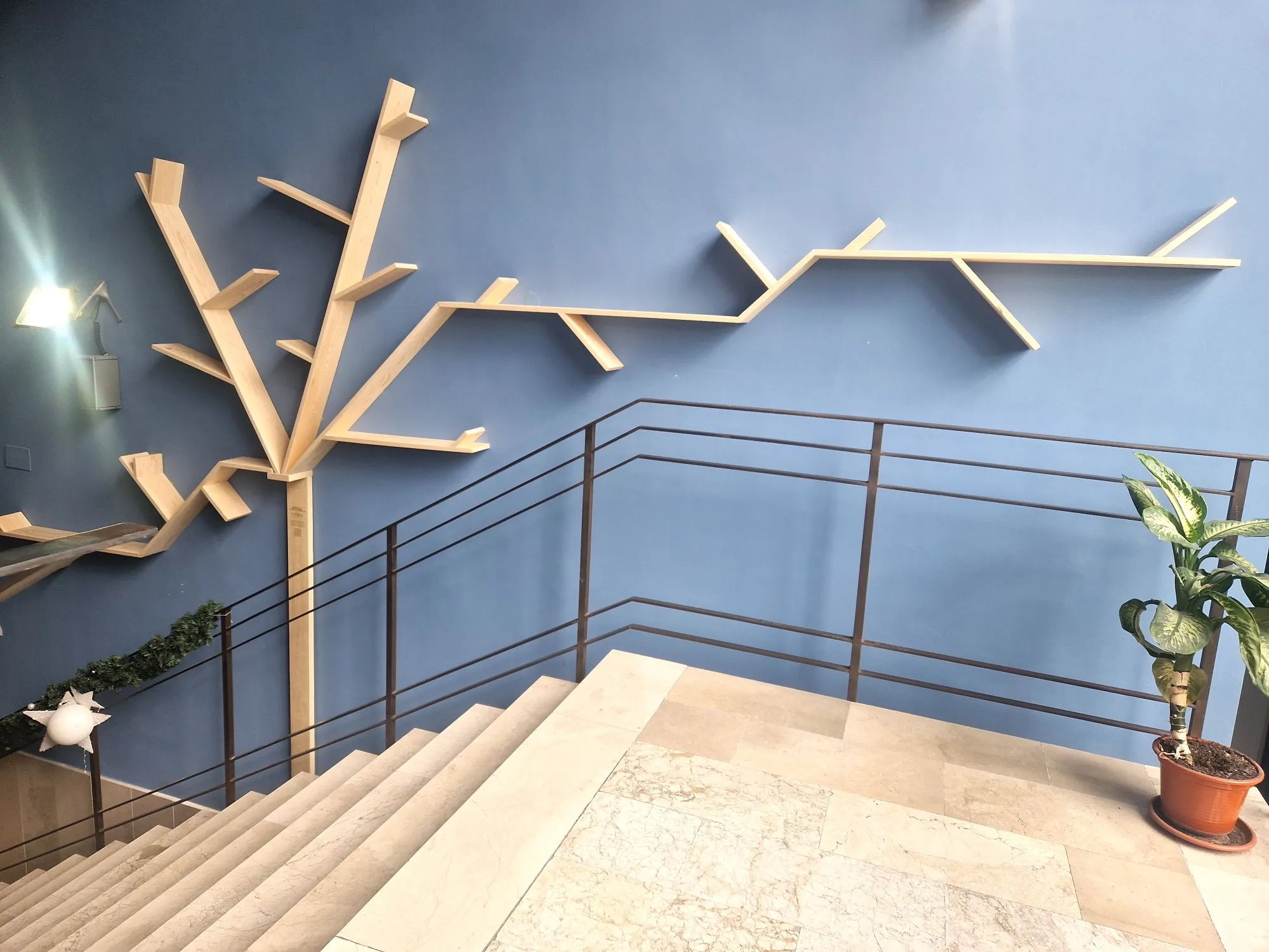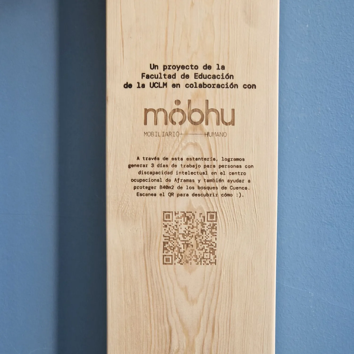 Ana Rosa, Decana de la Facultad, nos contactó para crear una estantería creativa en la escalera principal. Este elemento nos pareció que iba plenamente en sintonía con la energía de la Facultad; además de representar un elemento muy representativo para la educación; los libros, el conocimiento. Fue un reto realizar un trabajo de estas características, fabricado de manera artesanal en el centro ocupacional de Aframas (Cuenca); y con madera certificada procedente también de los bosques de la provincia.