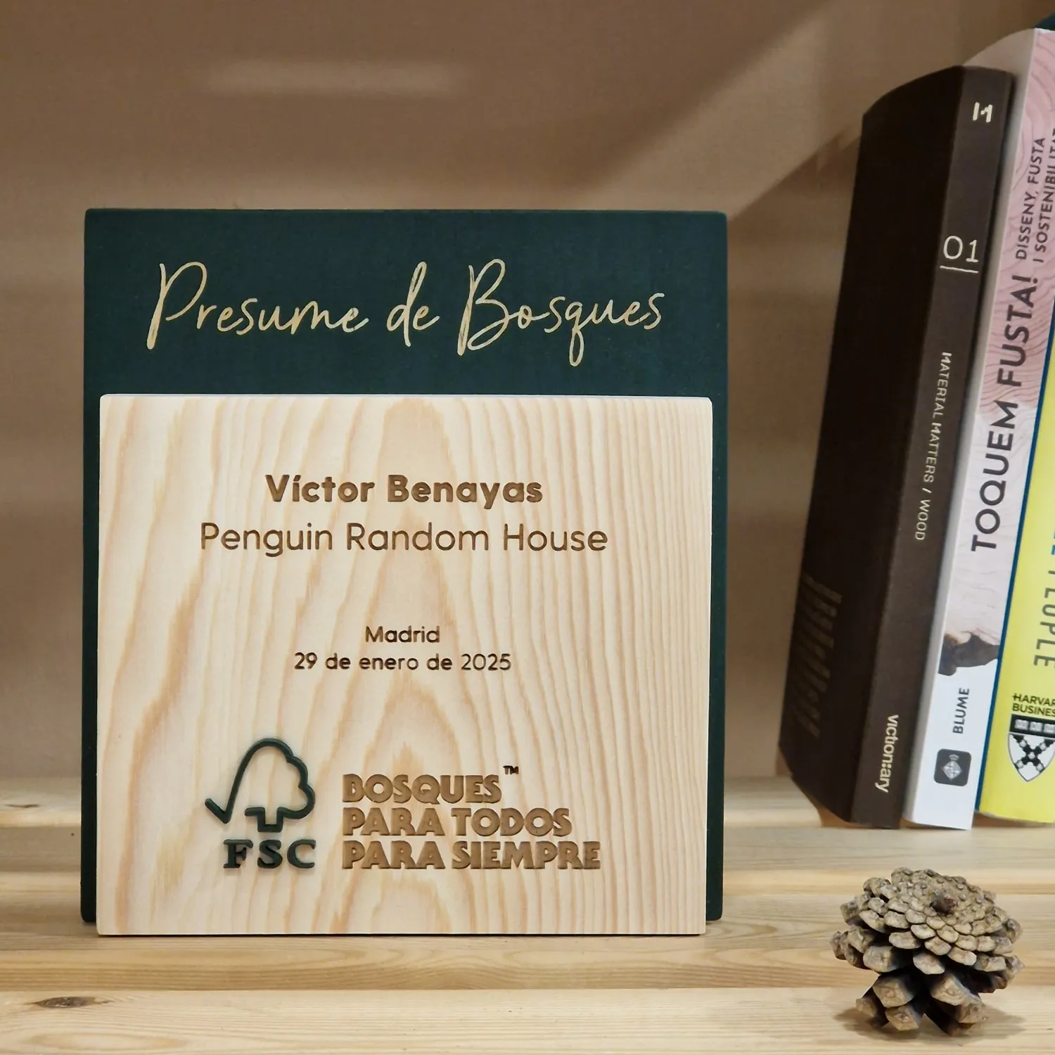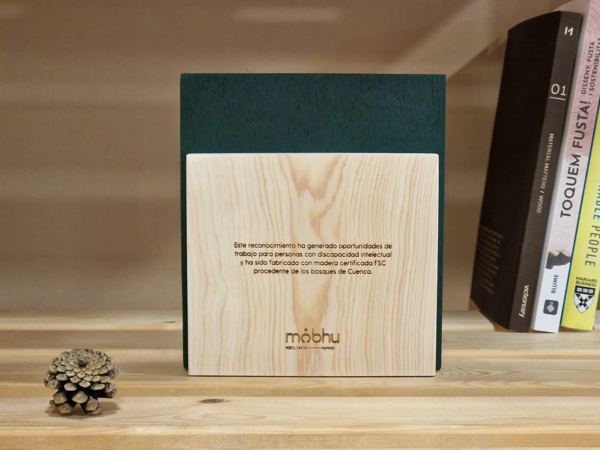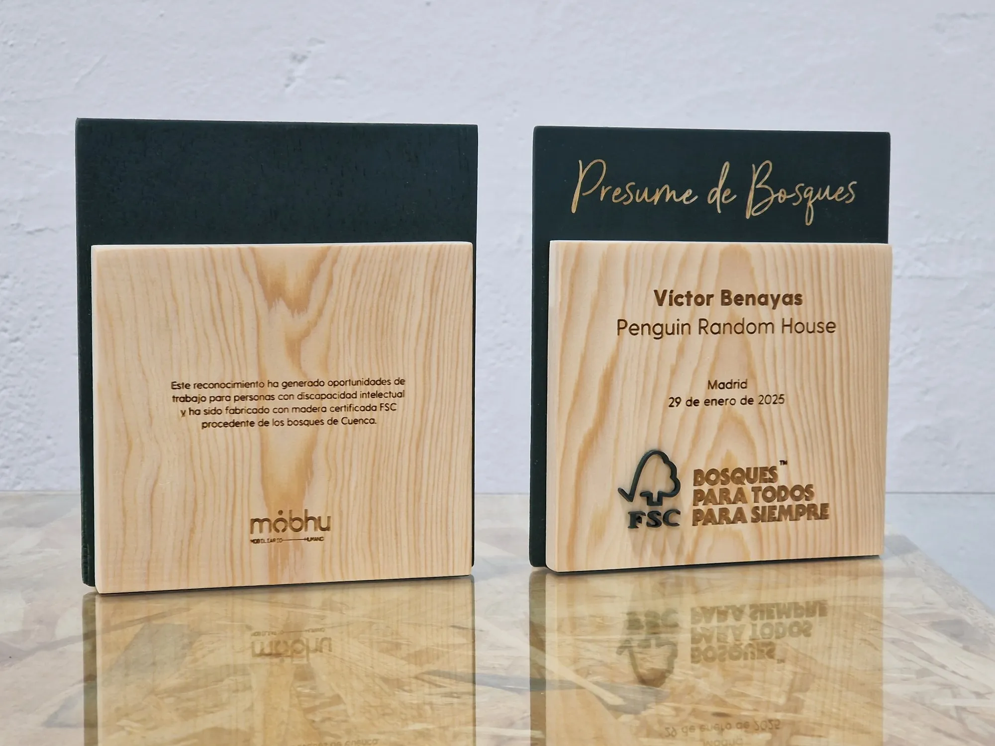 Alejandro, responsable de Comunicación de FSC España, se puso en contacto con nosotr@s para colaborar en el diseño y fabricación de unos reconocimientos en el marco de la campaña "Presume de Bosques". La entrega se realizaría en Madrid, en el evento “Sostenibilidad: del consumidor al bosque”. En esta ocasión, fabricamos las piezas principales en el centro ocupacional Aspadec (Cuenca); con madera de pino laricio procedente de los bosques de la provincia. La capa intermedia, chapa de madera de 4 mm, la lacamos del color corporativo de FSC, al igual que las letras y el icono principal. Combinamos estos detalles con el grabado láser de CO2 y, ¡ta-chán!, el resultado gustó muchísimo. Tenemos que decir que este proyecto nos hizo especial ilusión, pues en Mobhu precisamente estamos comprometid@s con el uso de madera certificada FSC para la fabricación de todos nuestros productos. Un placer enorme trabajar de su mano en esta ocasión :).