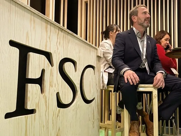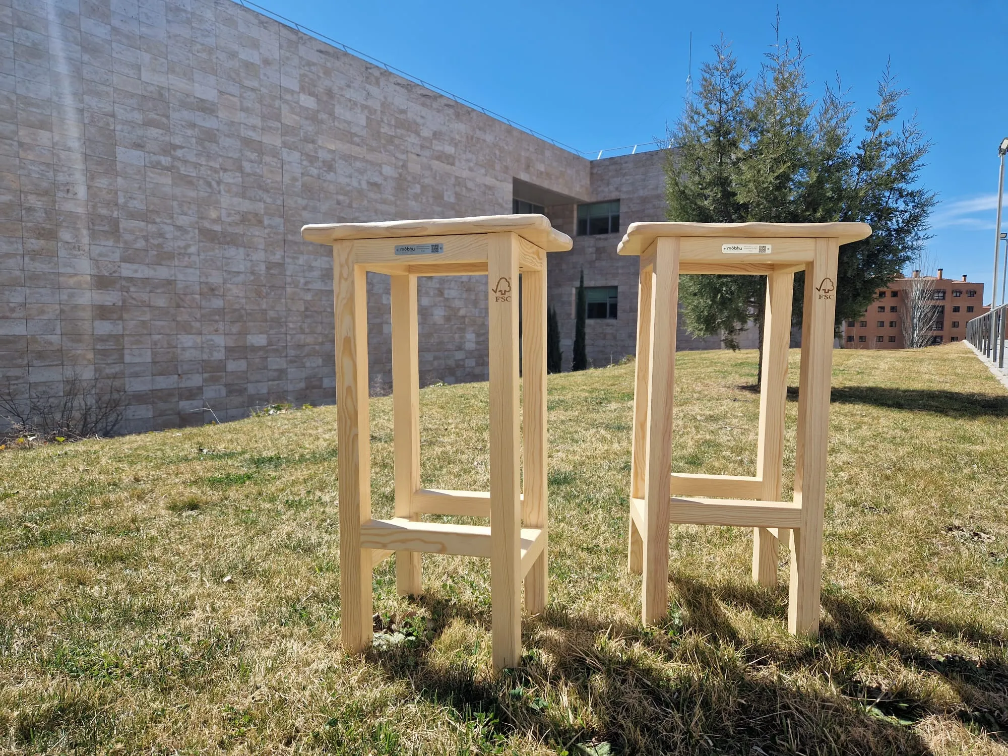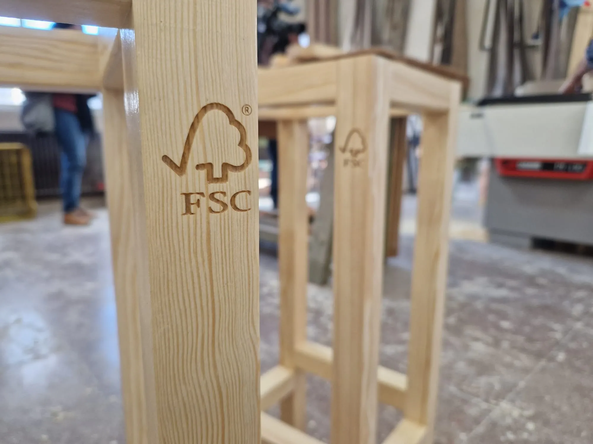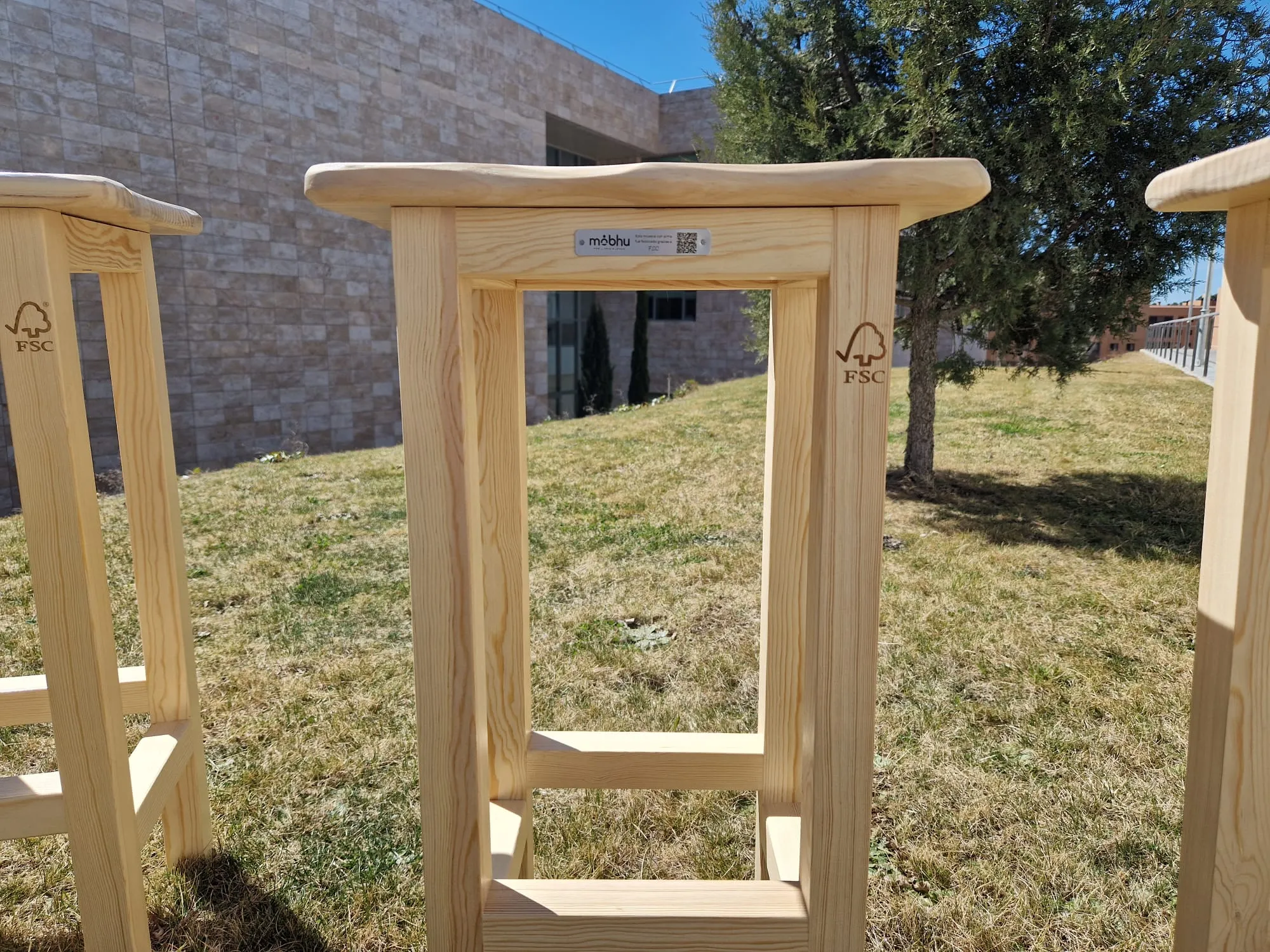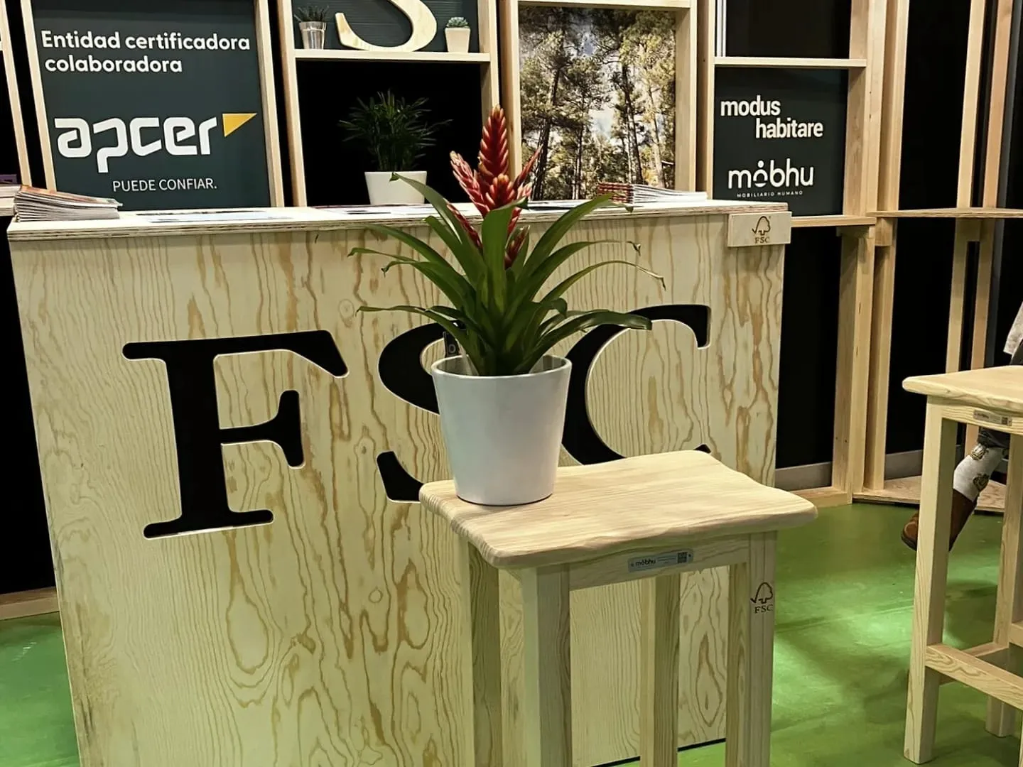 ¿Qué mejor taburetes que unos fabricados con madera certificada FSC para el stand de la propia FSC?